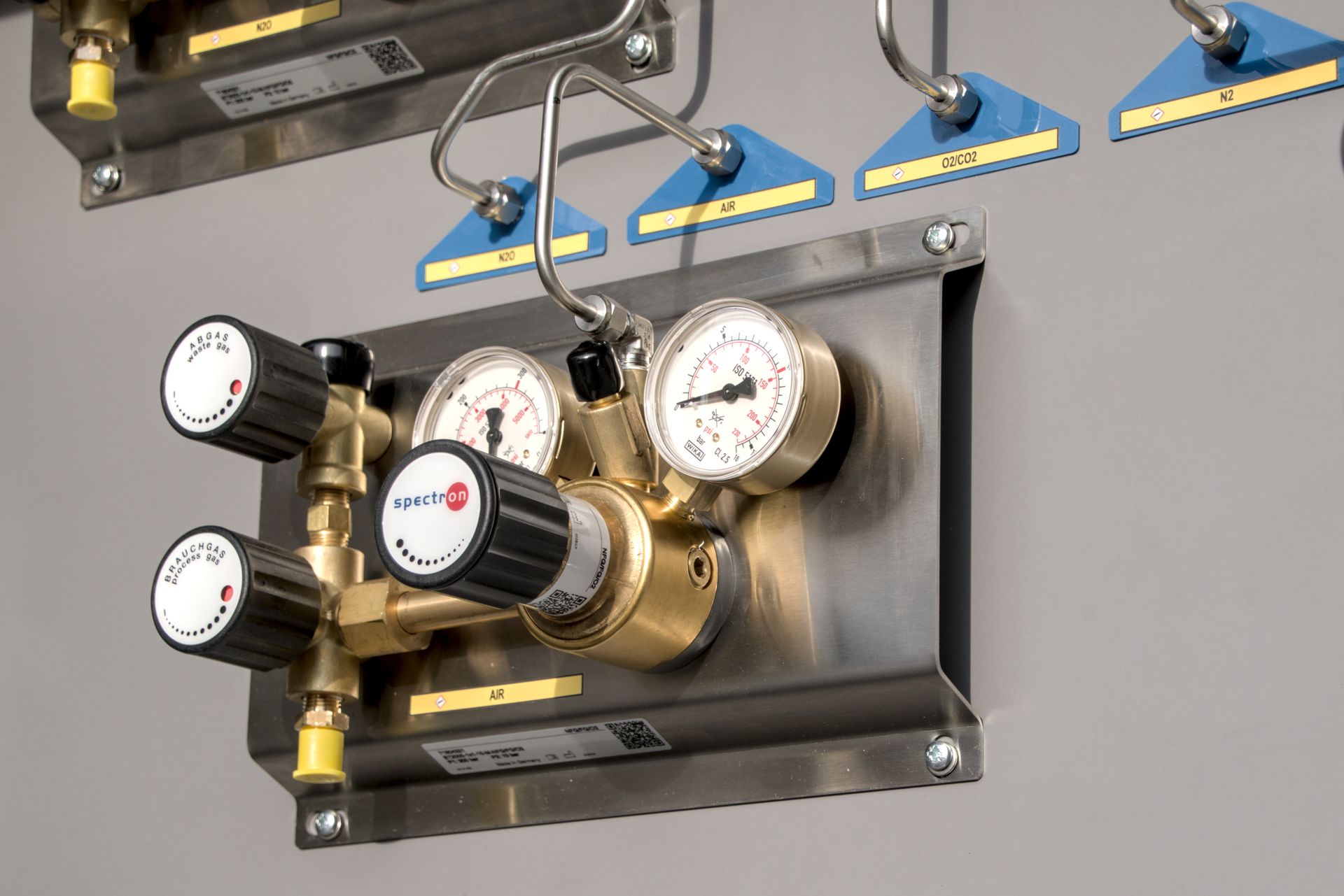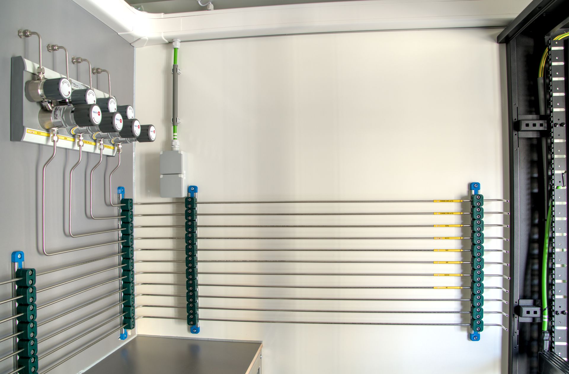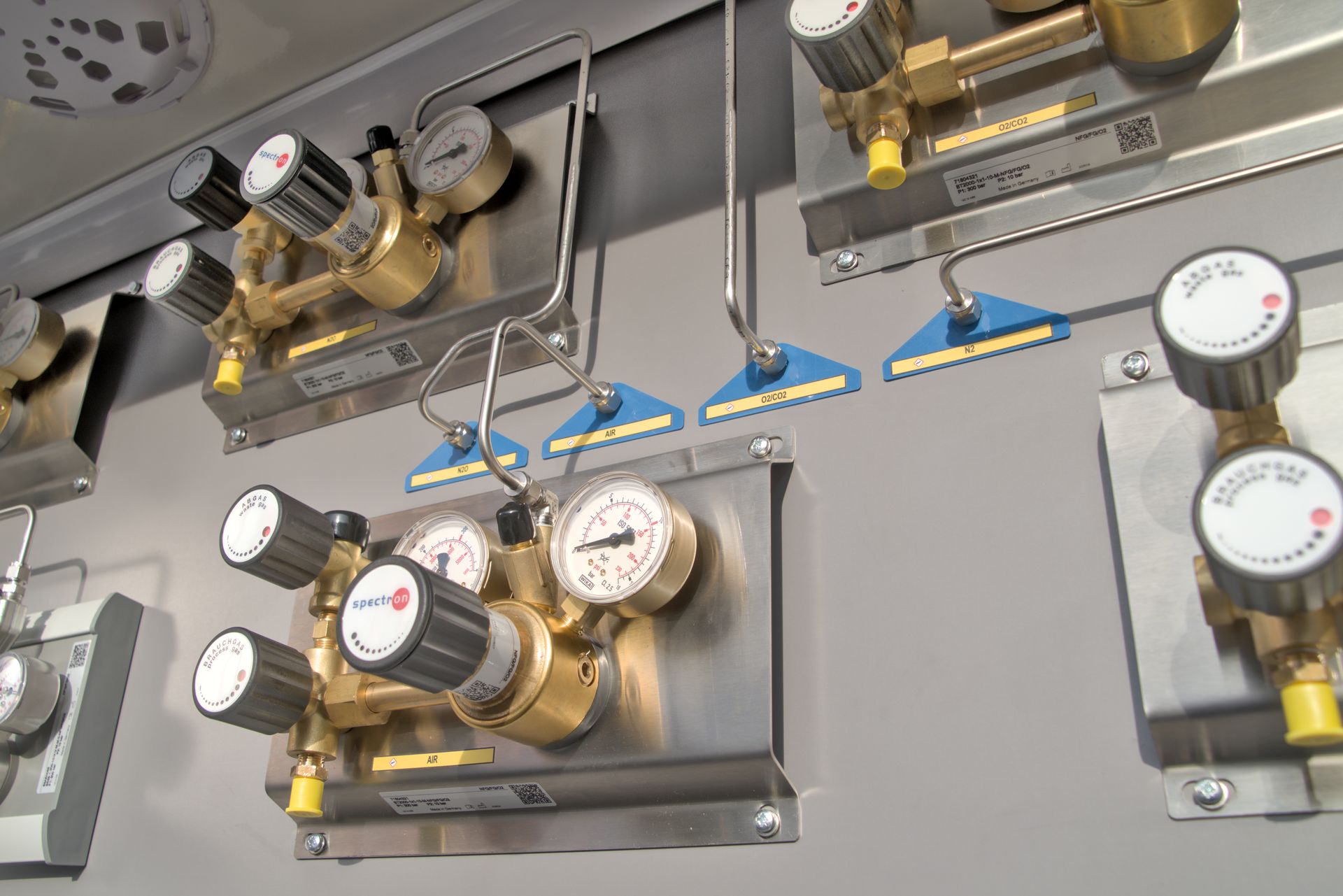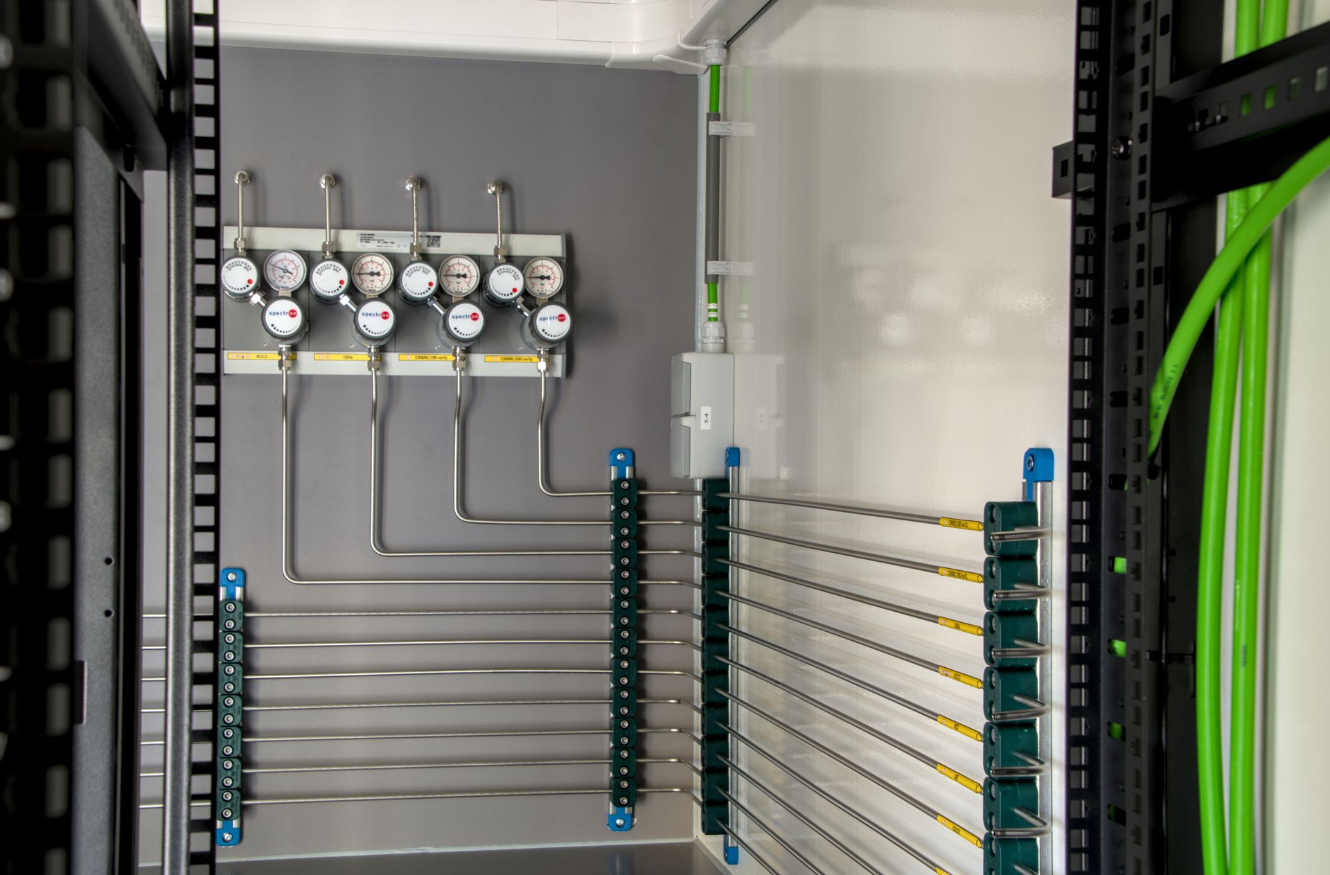 In de meetruimte is de installatie opgebouwd met hoogwaardige drukregelaars en overzichtelijk RVS leidingwerk. Iedere gasstroom – waaronder stikstof, lucht en kalibratiegassen – wordt afzonderlijk geregeld en bewaakt.