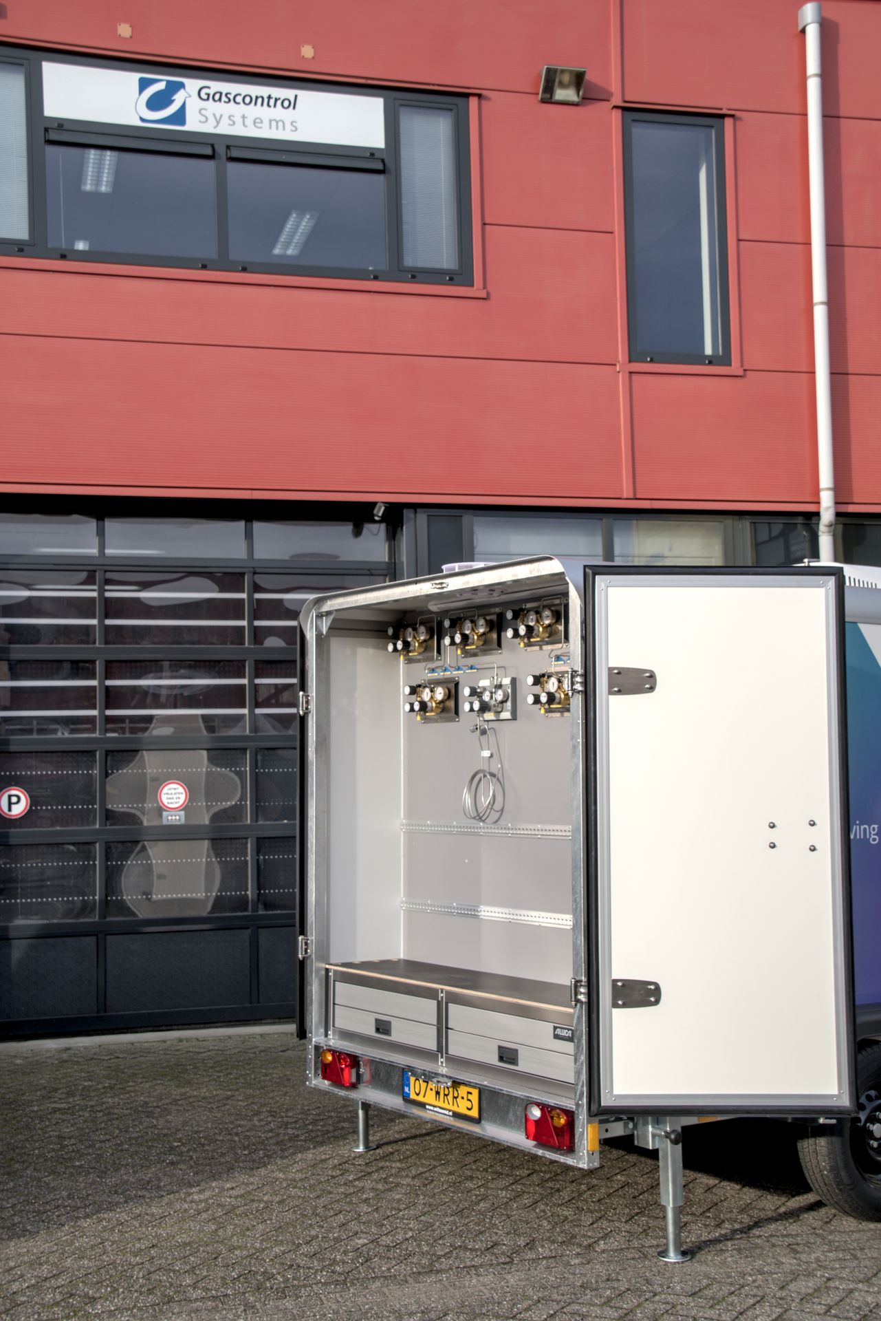 De gascilinders en hogedrukapparatuur zijn opgesteld aan de achterzijde van de aanhanger, gescheiden van de meetruimte door een vast schot. De fijnregeling en distributie bevinden zich in het inwendige van de meetruimte zelf.